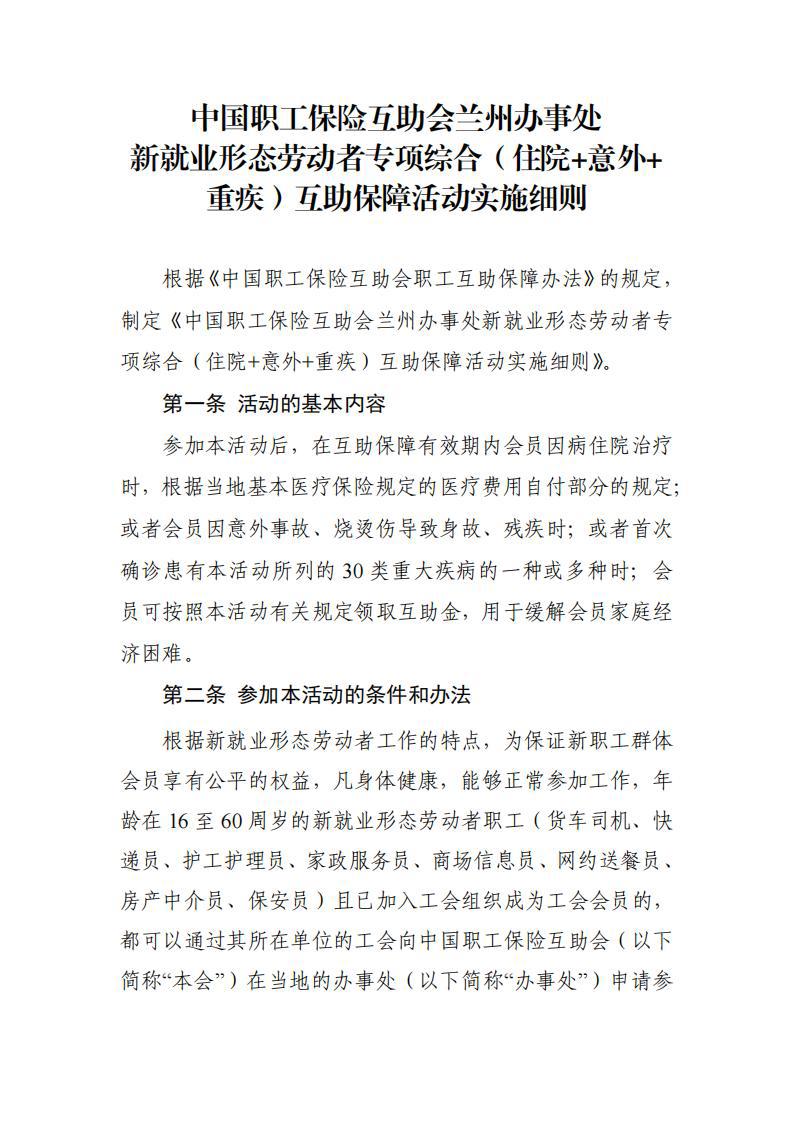 附件:中国职工保险互助会兰州办事处新就业形态劳动者专项综合(住院+意外+重疾)互助保障活动实施细则.pdf